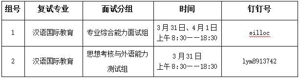 汉语国际教育专业学位面试分为:1.专业综合能力面试组;2.思想政治素质和品德考核与外语能力测试组。两个小组同时进行,考生需要分别加两个面试组的钉钉号。