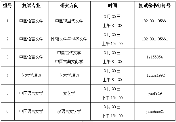 学术学位硕士生复试按专业分6个小组进行。